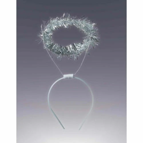 No angel costume is complete without a halo and wings! Silver tinsel halo sits on a thin plastic headband.