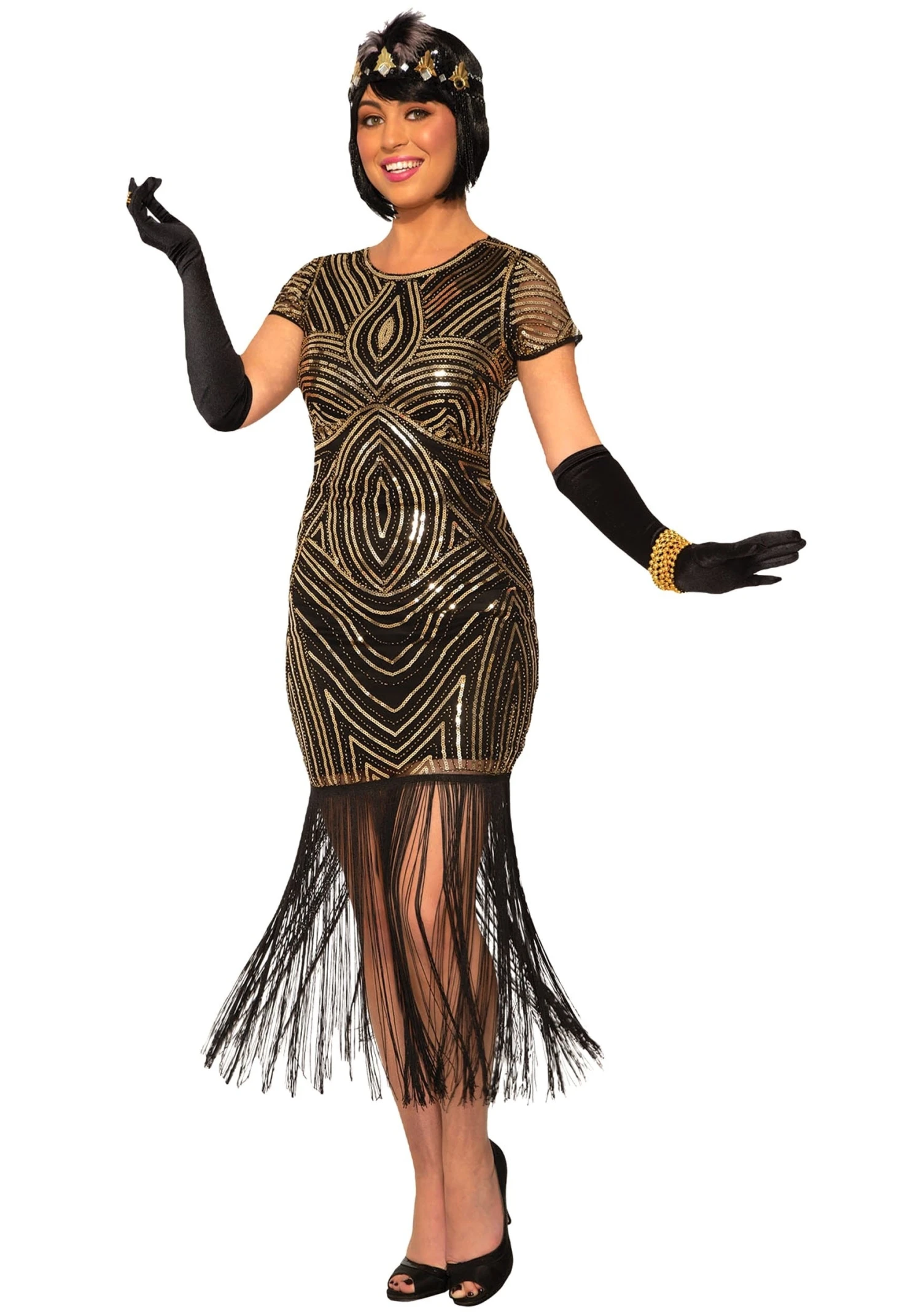 This gold and black Art Deco Flapper dress has a sequined pattern and a gorgeous fringe trimming.Â