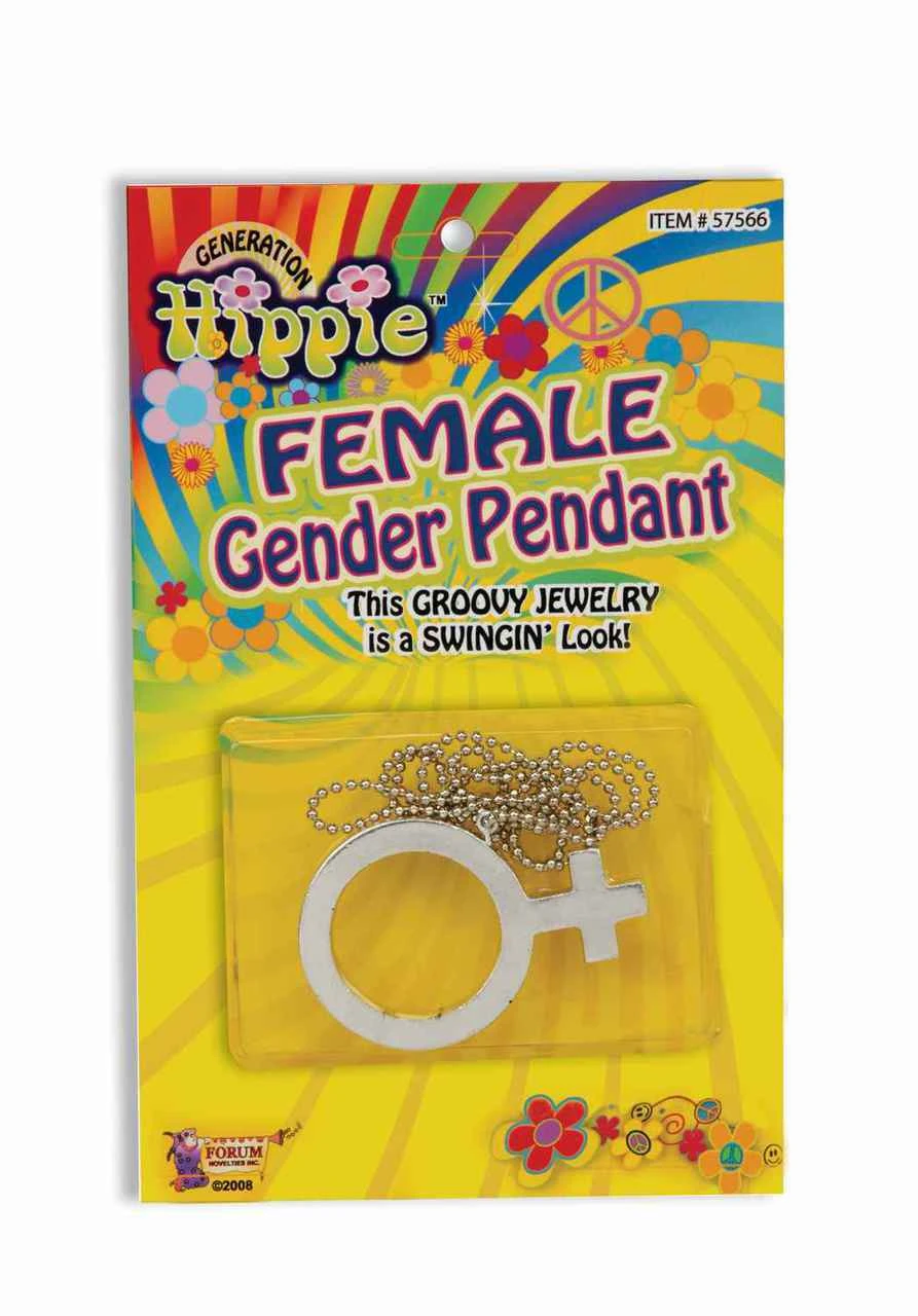 This plastic female gender pendant comes with a long black tie for a comfortable fit.