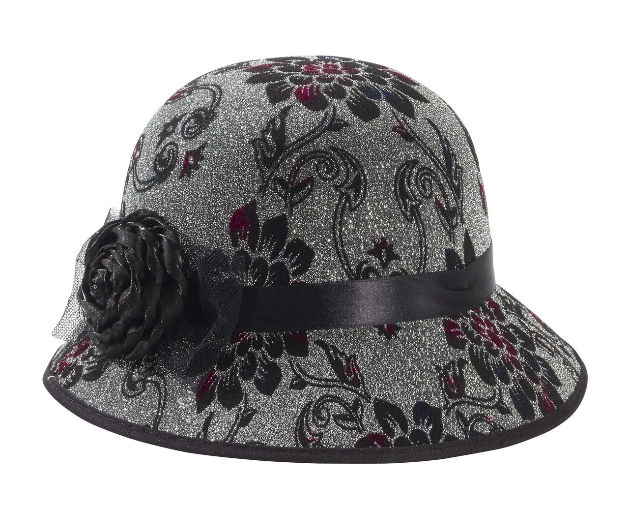 Sparkly gray hat with blue and red floral print, accented by black trim, band, and fabric flower.