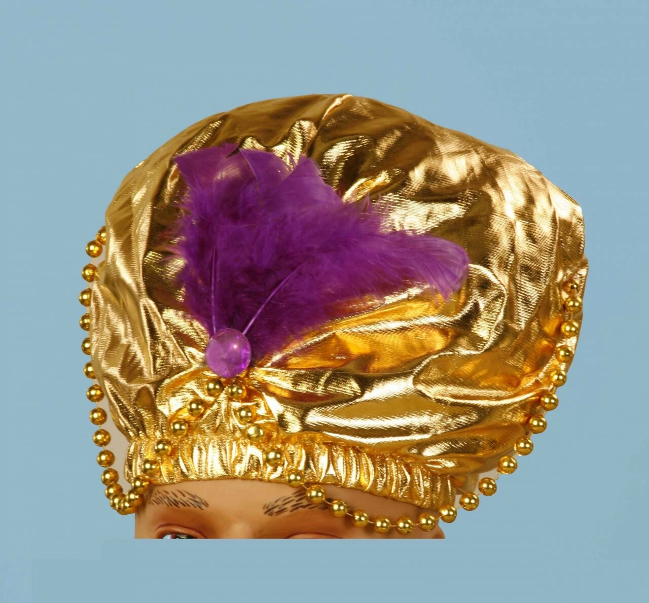 Oversized gold lame turban with strings of beads and purple feather accent.
