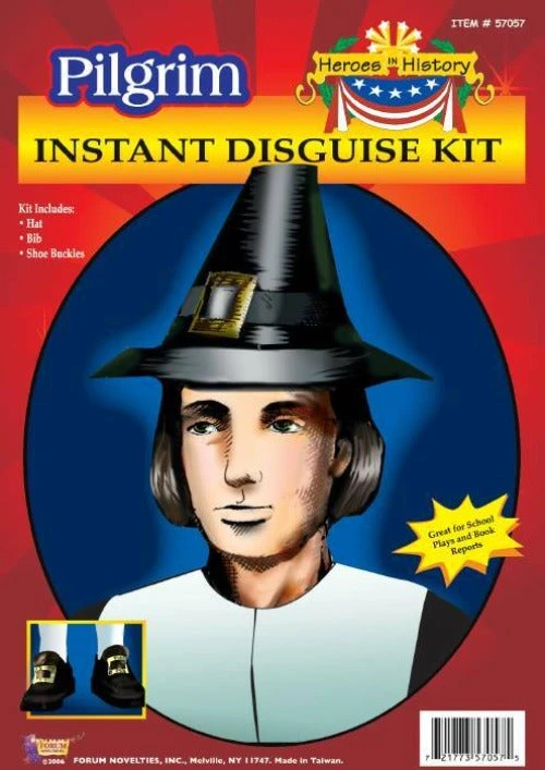 The Pilgrim Man or Woman Instant Disguise kit is perfect for school reports, Thanksgiving theater pieces, or dress-up fun! Pilgrim Man includes black felt hat and shoe buckles. Pilgrim Woman includes white bonnet and collar and shoe buckles. Each kit sold separately.