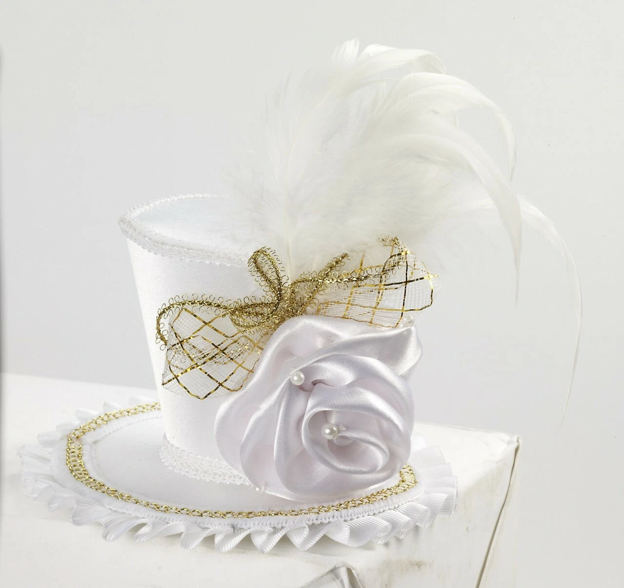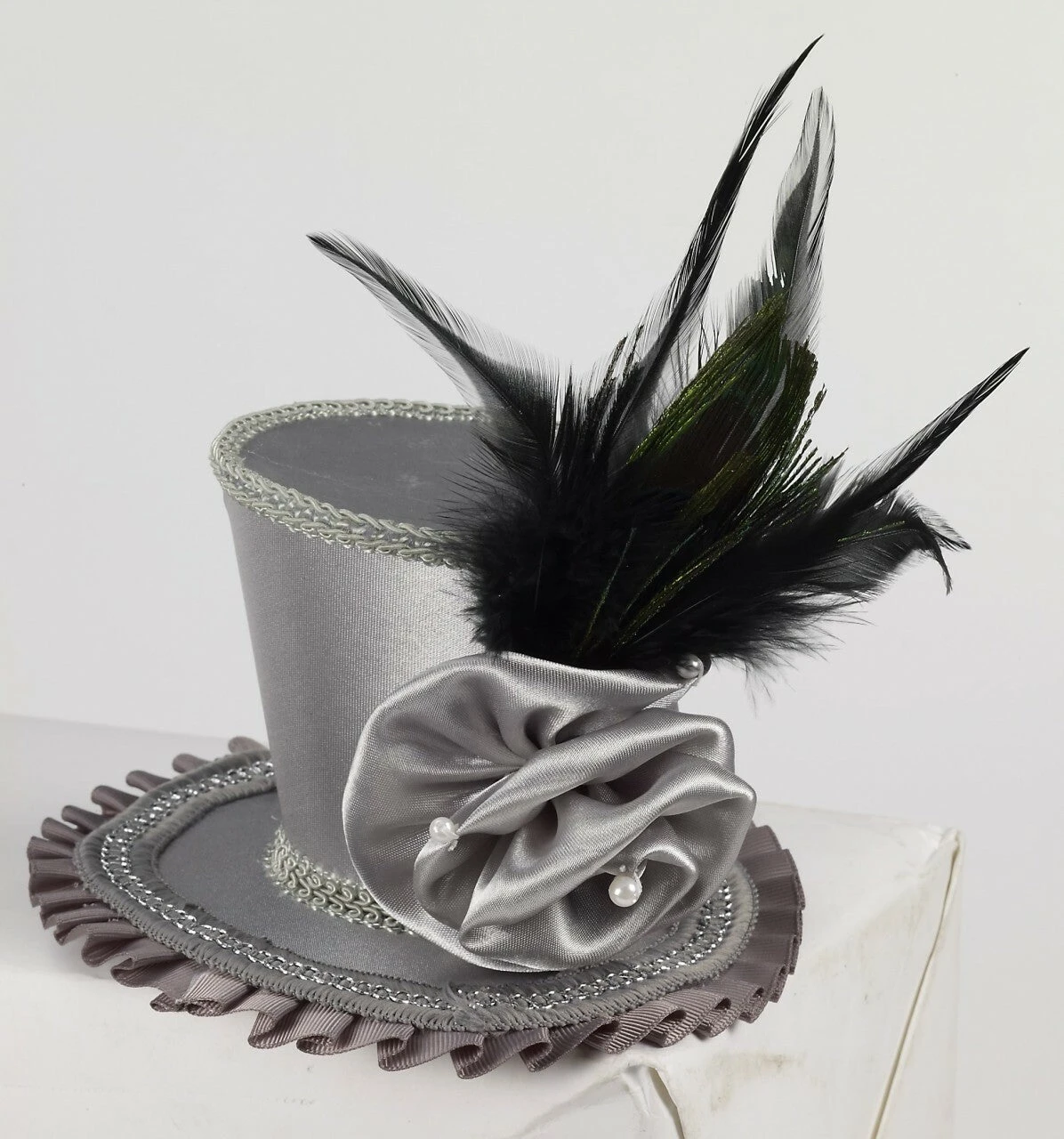 Mini silk top hat with pearl edged rose and feather detail.Â