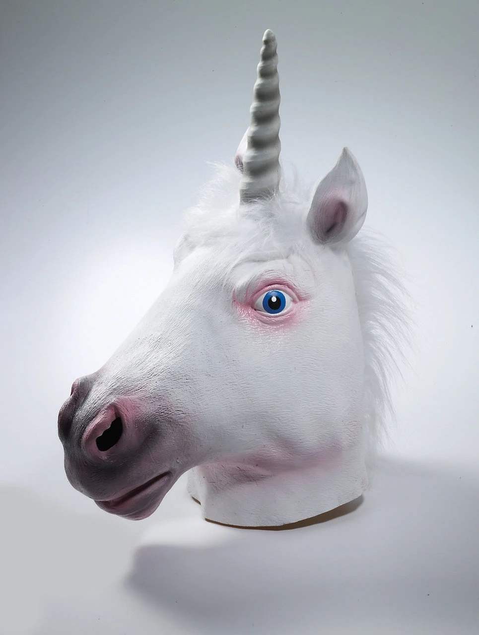Full-head Latex Unicorn Mask with white fur sized for adults.